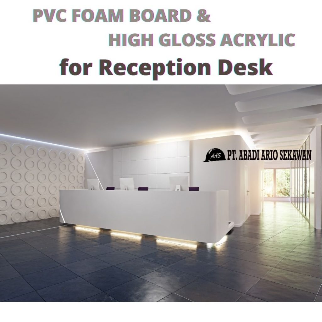 Meja Receptionist menggunakan kombinasi bahan PVC Foam Board, Plywood, dan High Gloss Acrylic.